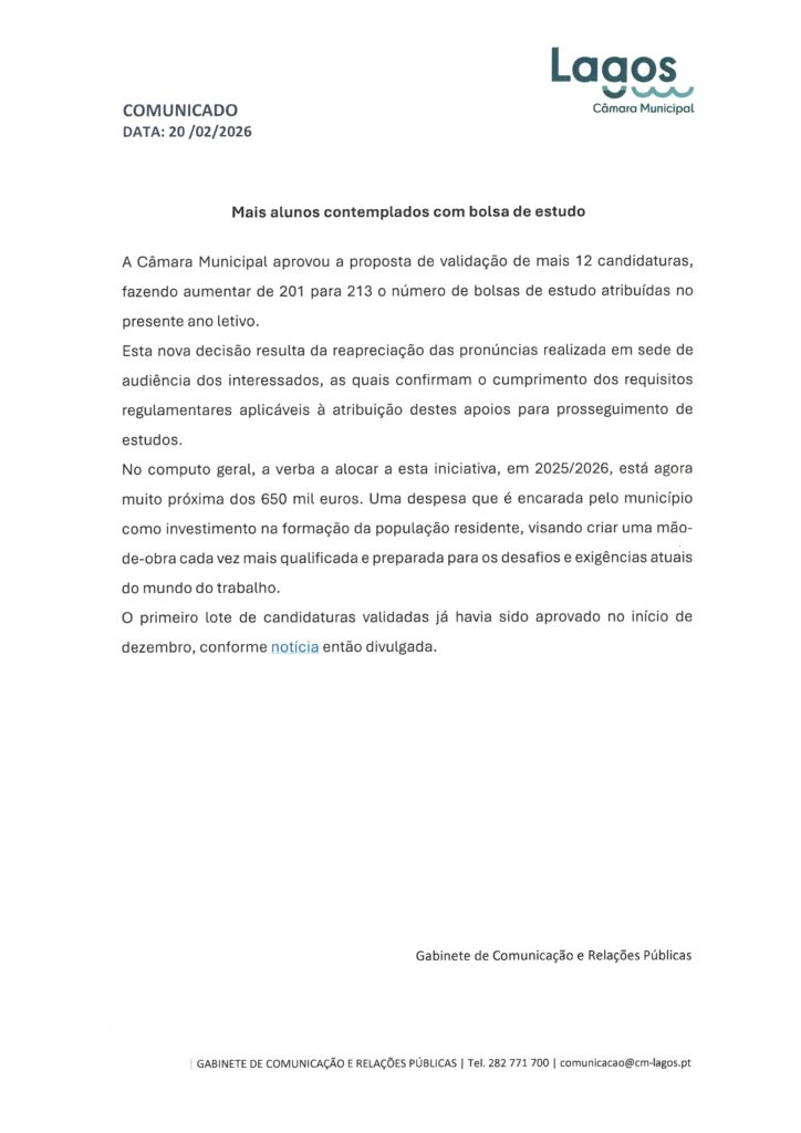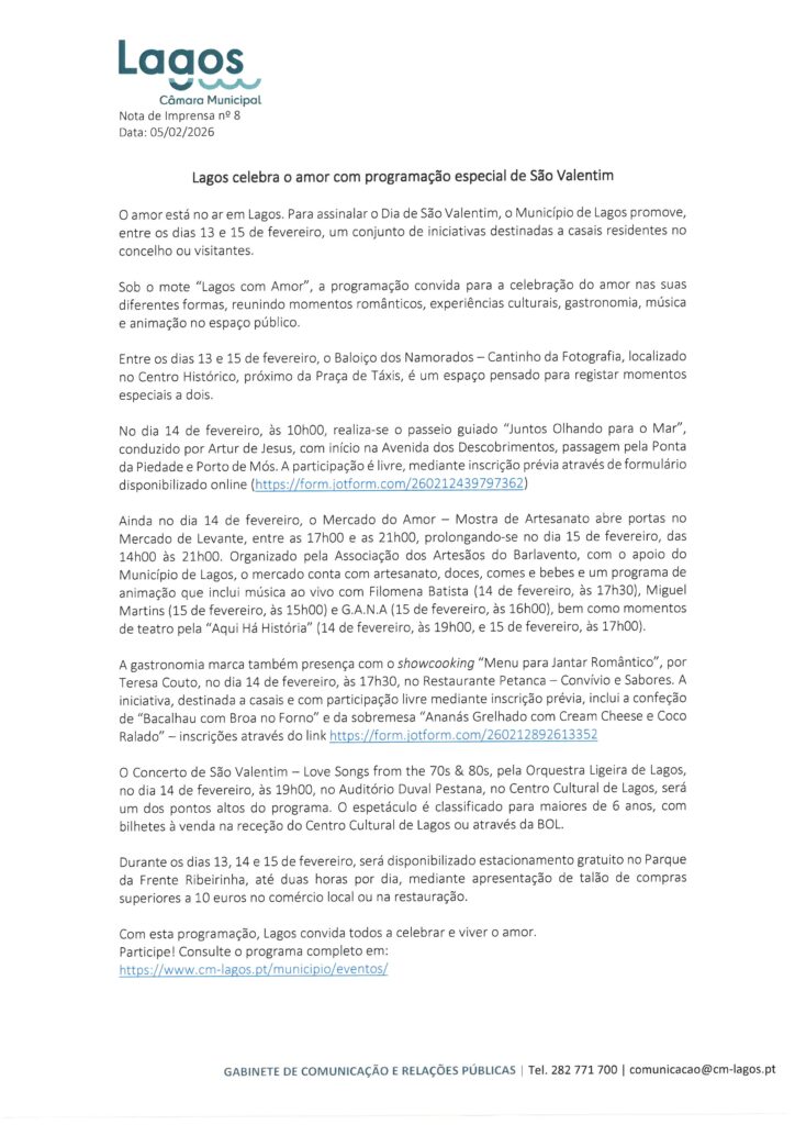 CÂMARA MUNICIPAL DE LAGOS – AVISO Nº72/2026 – ENCERRAMENTO / CONDICIONAMENTO AO TRÂNSITO – 21 FEVEREIRO 2026