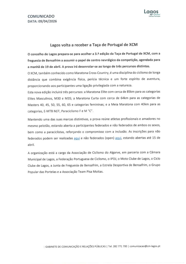 CÂMARA MUNICIPAL DE LAGOS – AVISO Nº122/2026 – ENCERRAMENTO/CONDICIONAMENTO AO TRÂNSITO – 12 ABRIL 2026