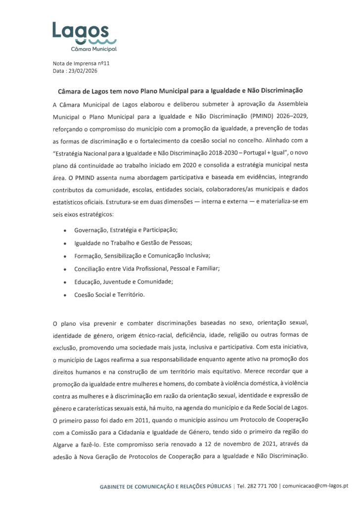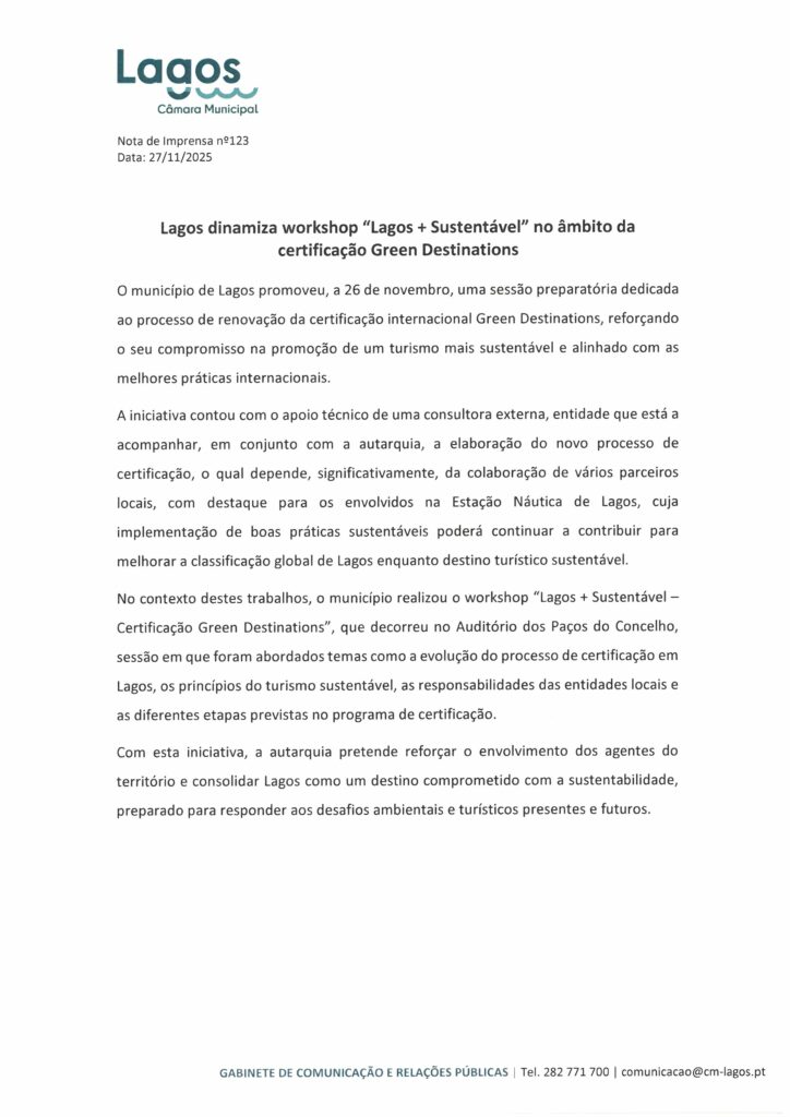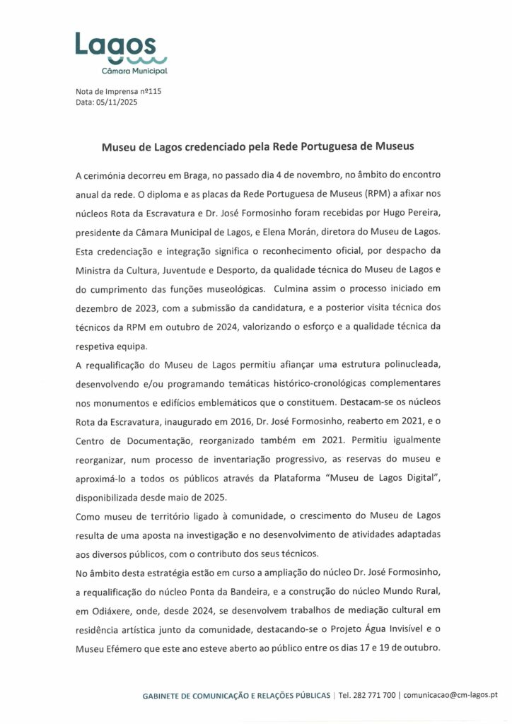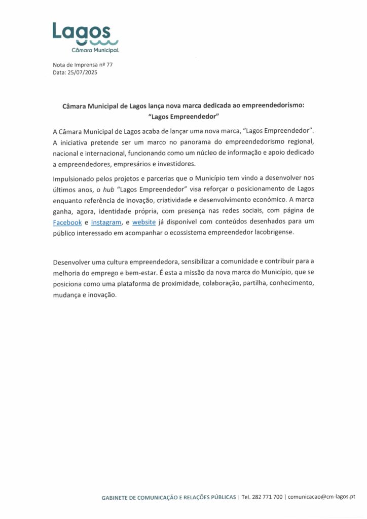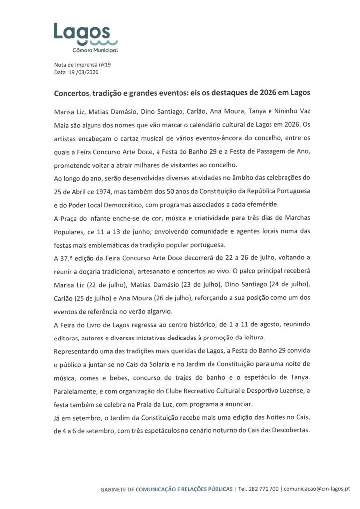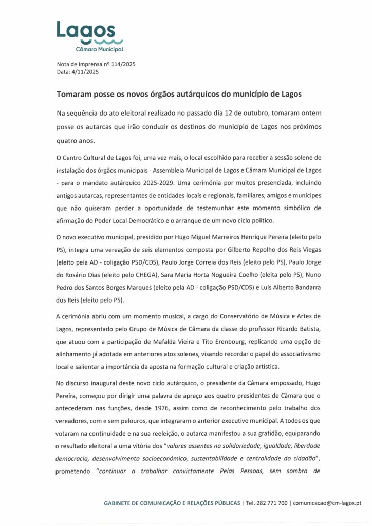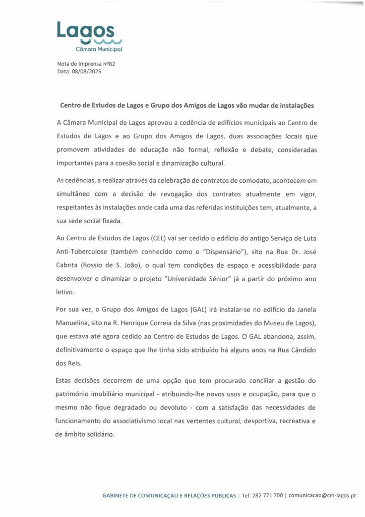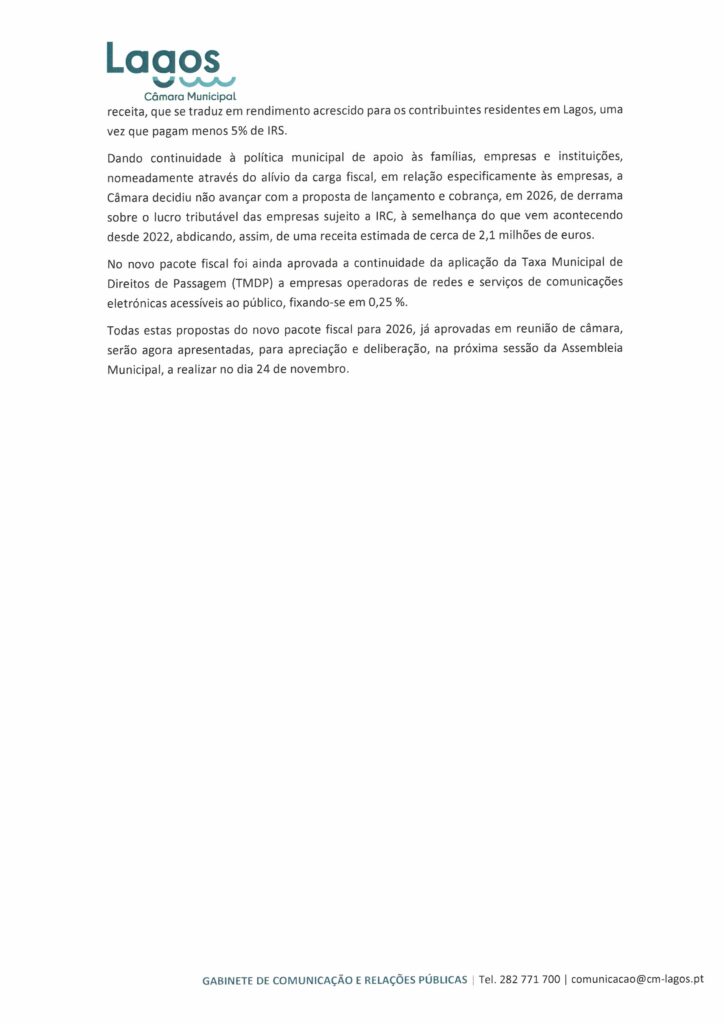 CÂMARA MUNICIPAL DE LAGOS - NOTAS DE IMPRENSA