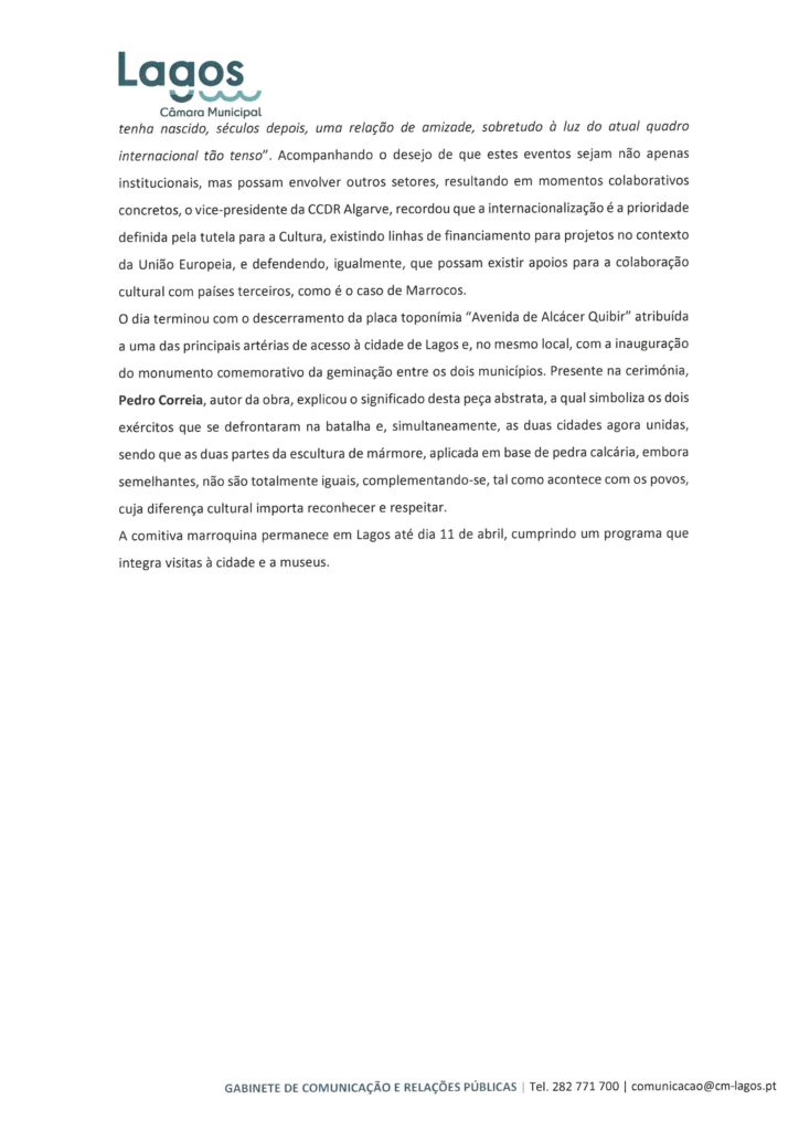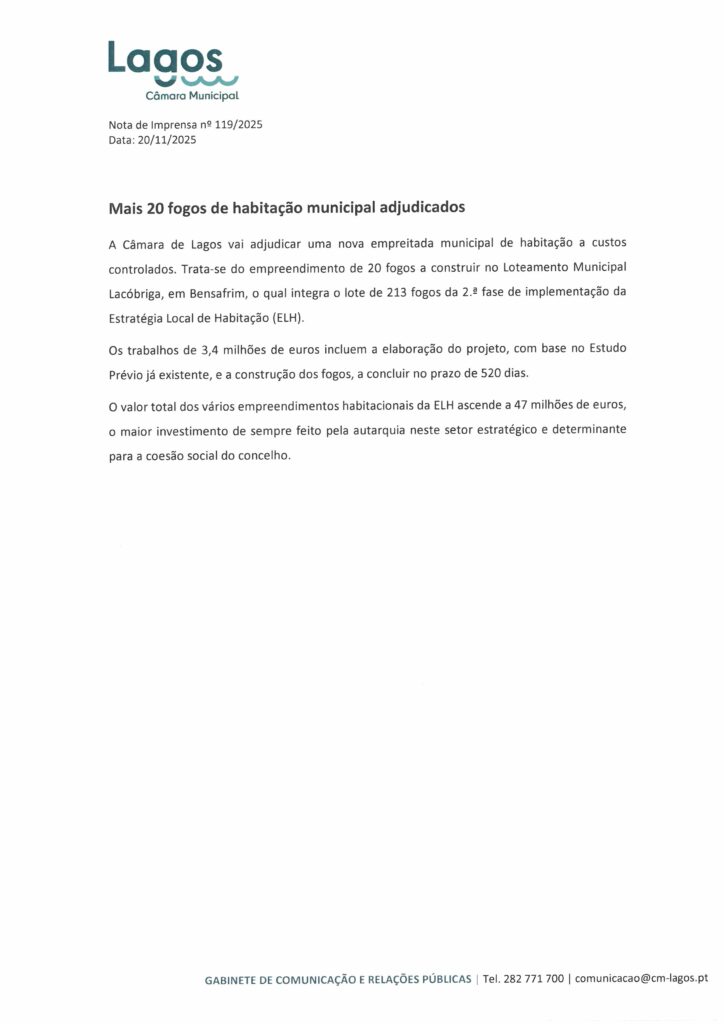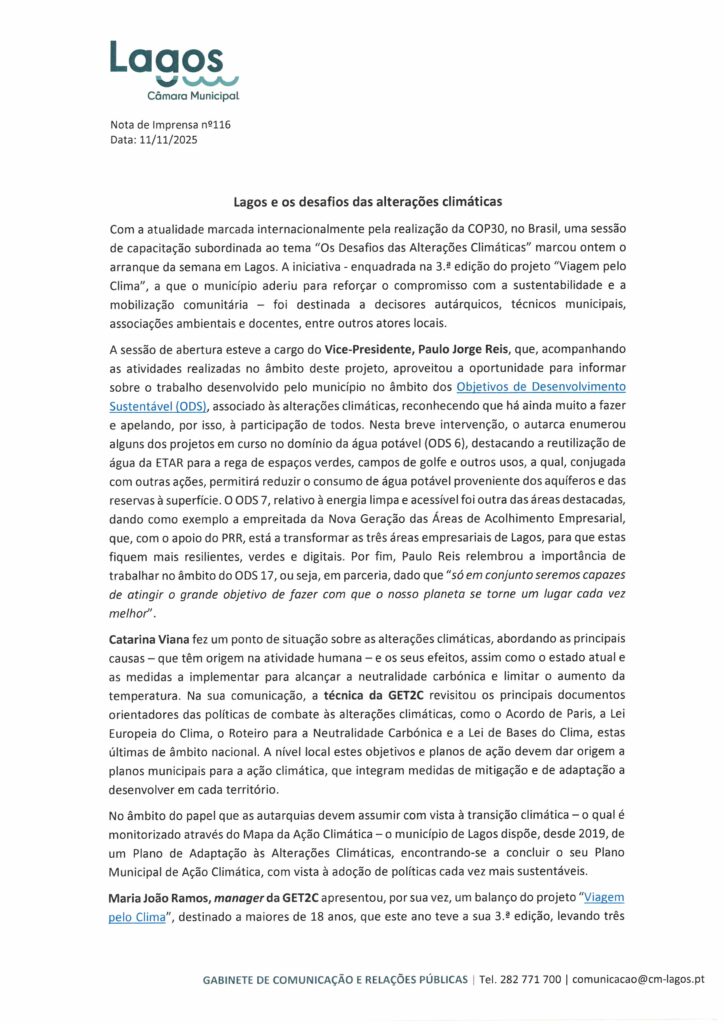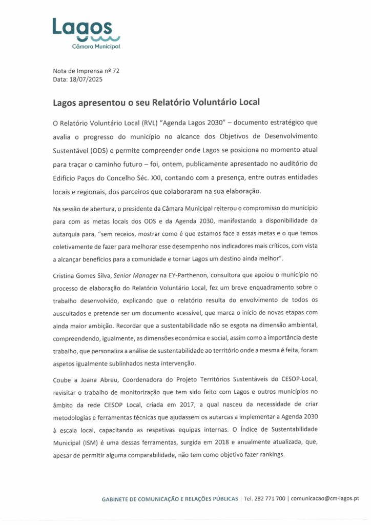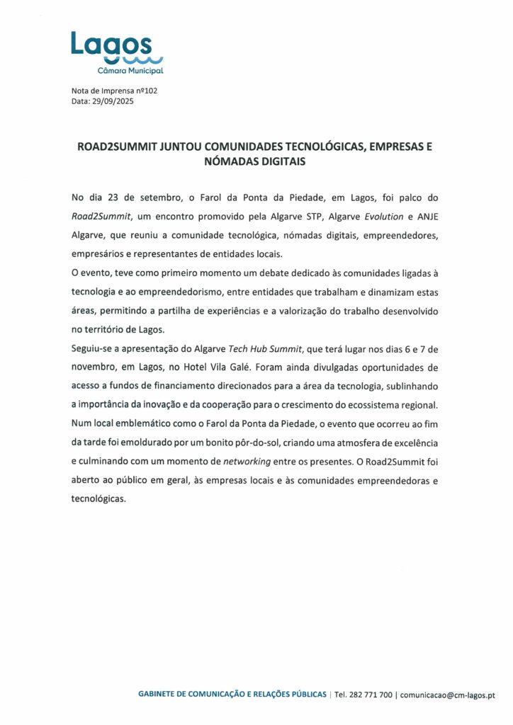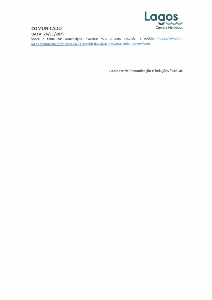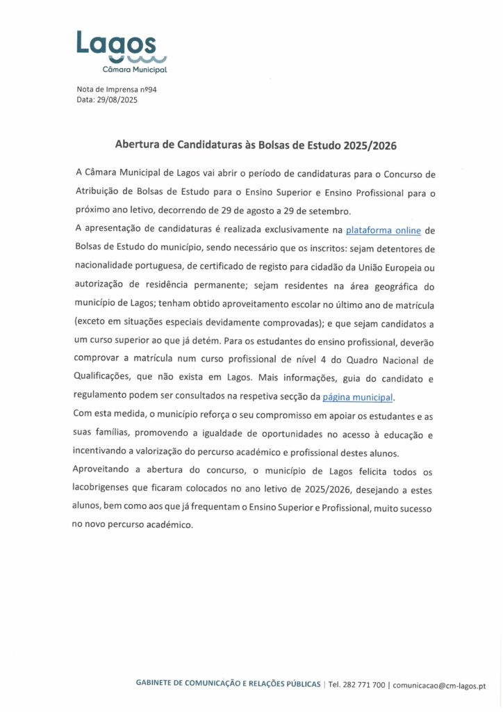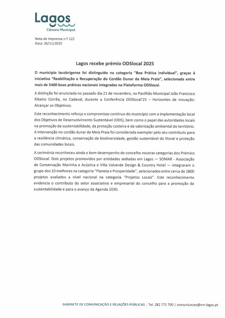 CÂMARA MUNICIPAL DE LAGOS - NOTAS DE IMPRENSA
