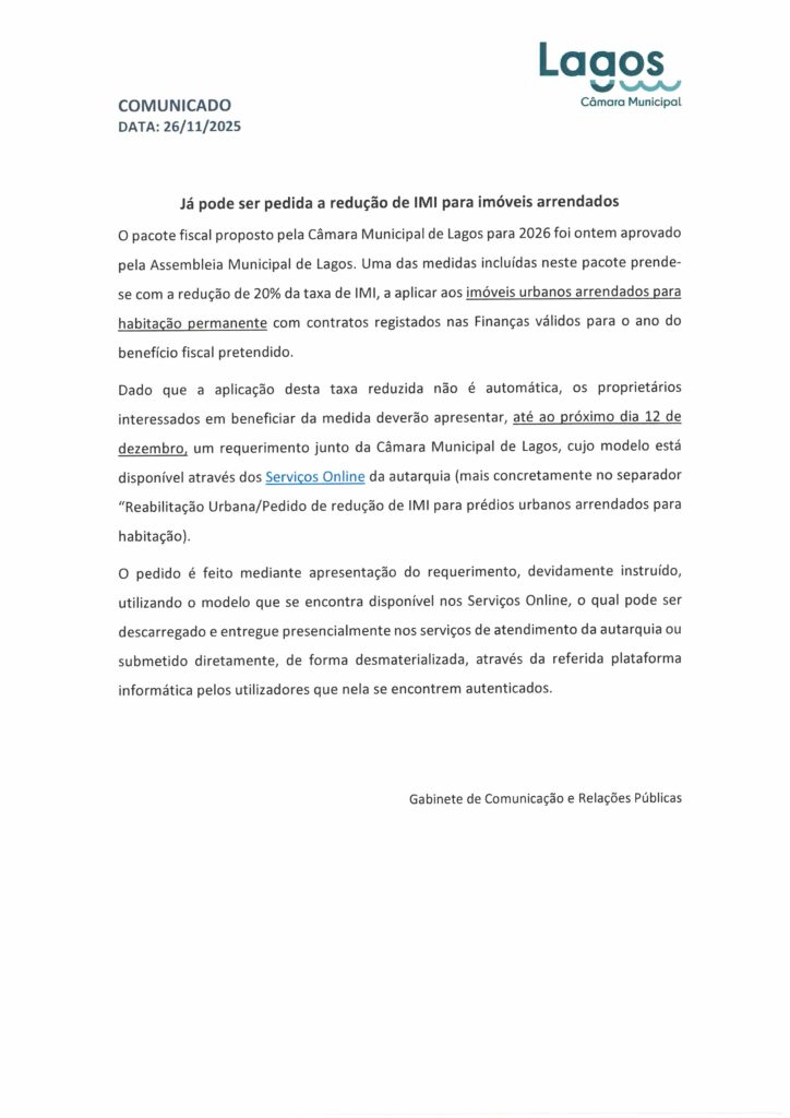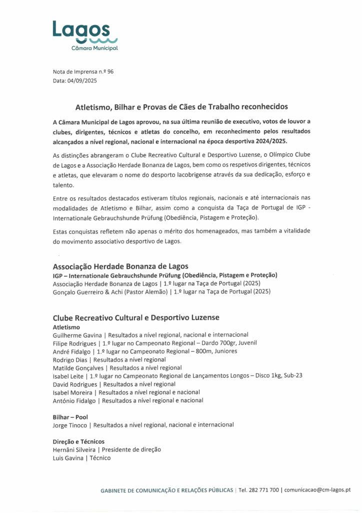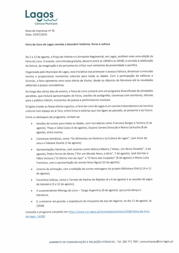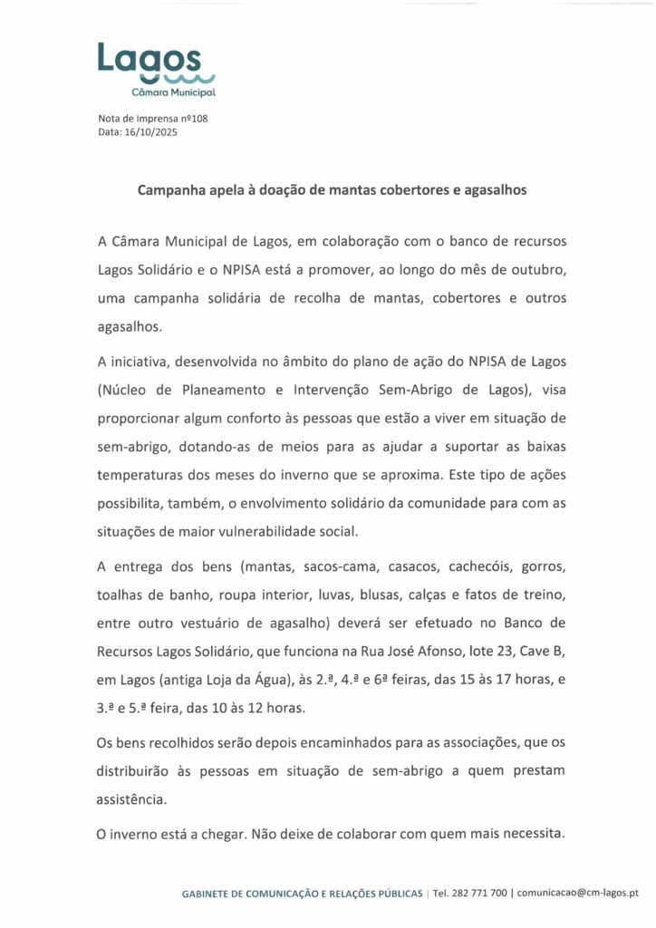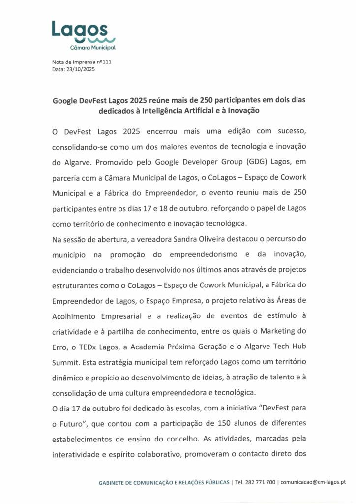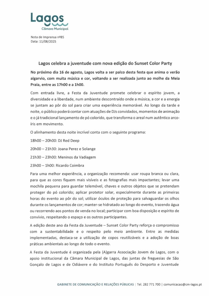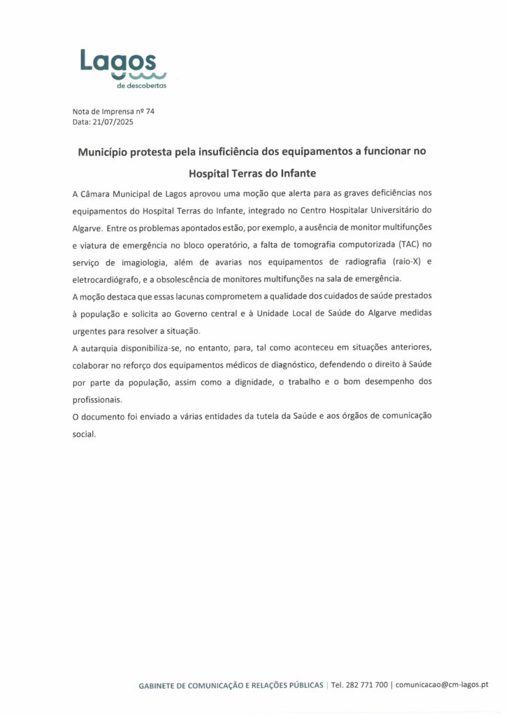 CÂMARA MUNICIPAL DE LAGOS - NOTAS DE IMPRENSA